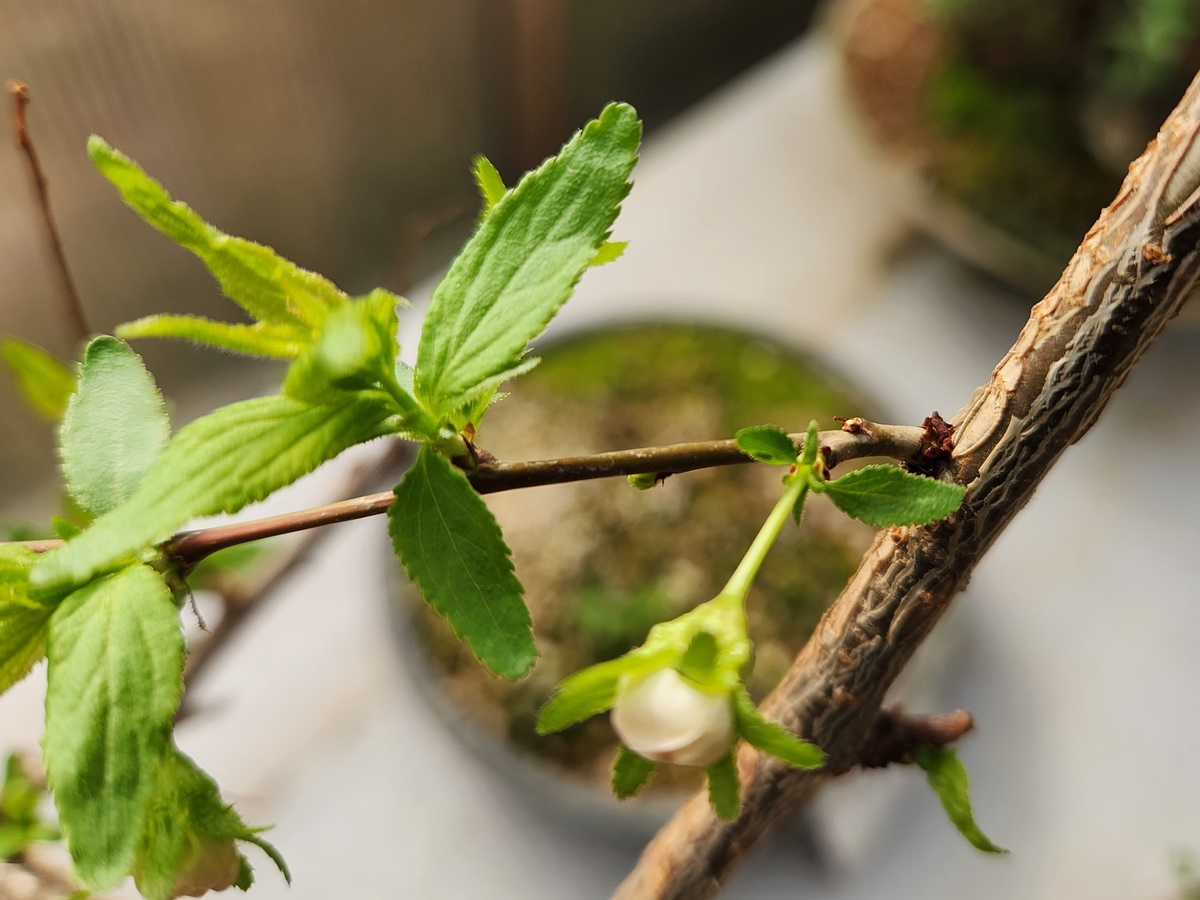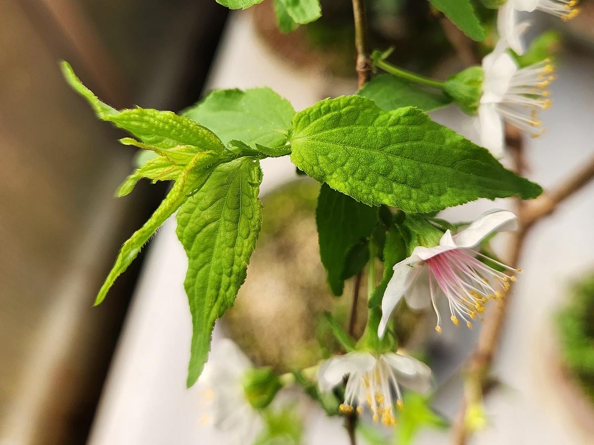 잎은 어긋나기하며 긴타원형이고 가장자리는 겹톱니가 있다.